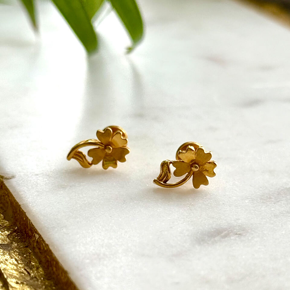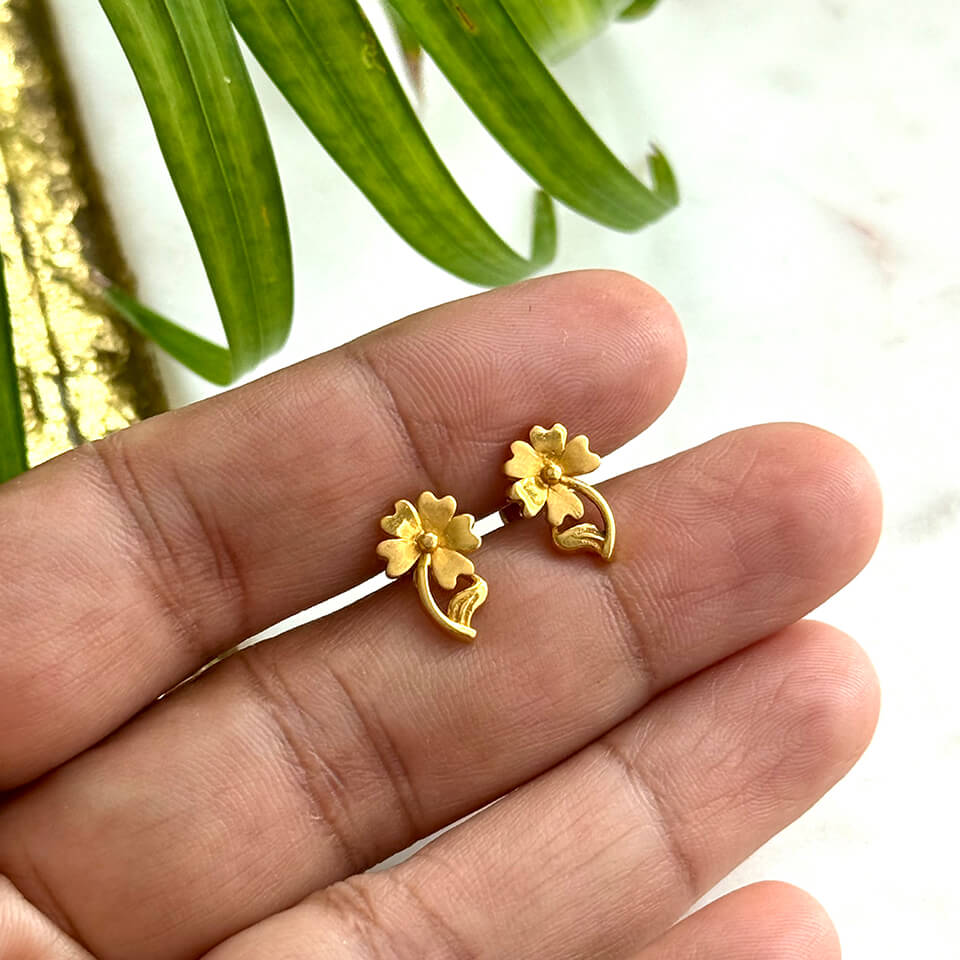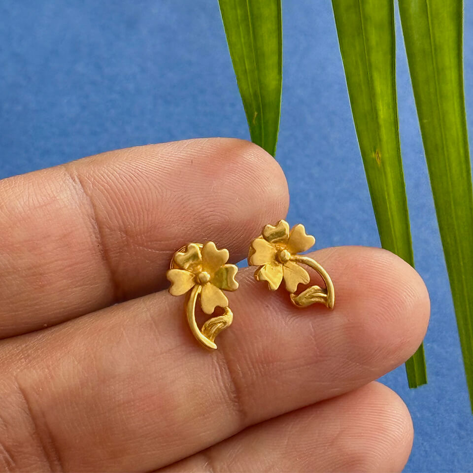 Experience refined craftsmanship with these exquisite 22kt Gold Lightweight Flower Design Studs. Their detailed floral pattern and pure gold shine offer timeless beauty with unmatched